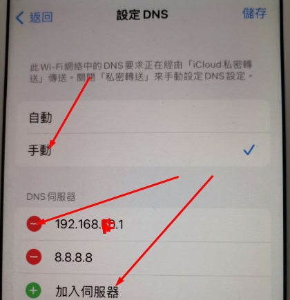 4. 点击手动,点击左侧红色-号,删除多余的DNS,并添加8.8.8.8为静态的DNS